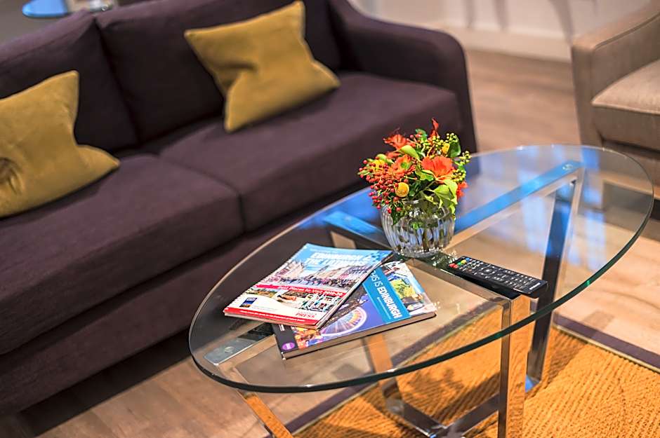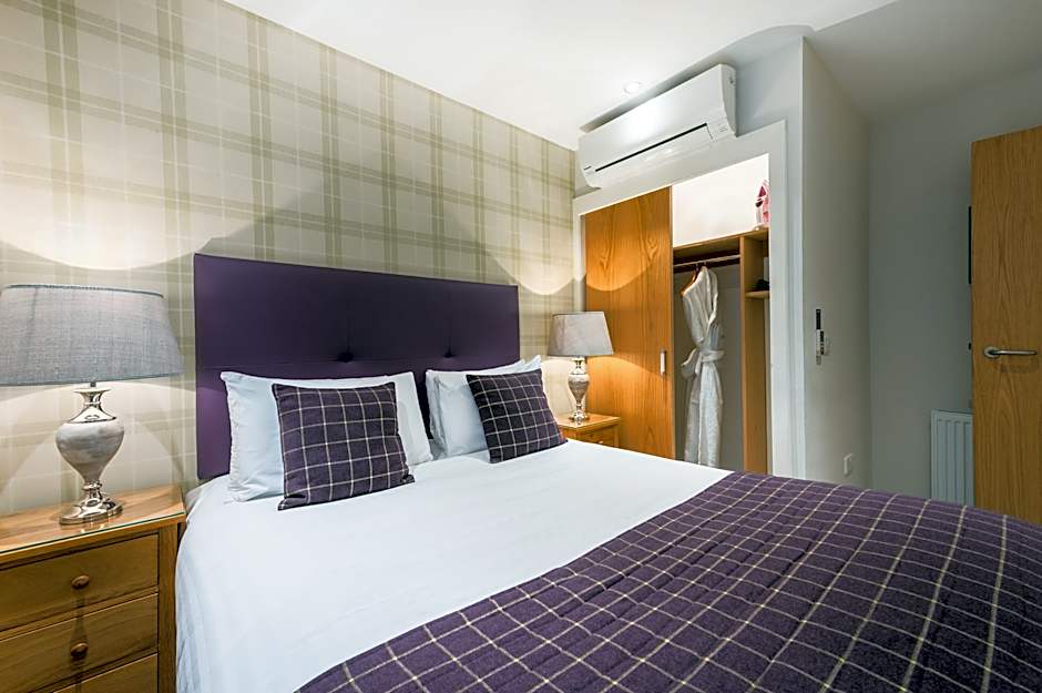 These apartments have a bedroom and separate living space. The bathroom has either a shower or bath with overhead shower. There is a TV in both the living room and bedroom areas.
